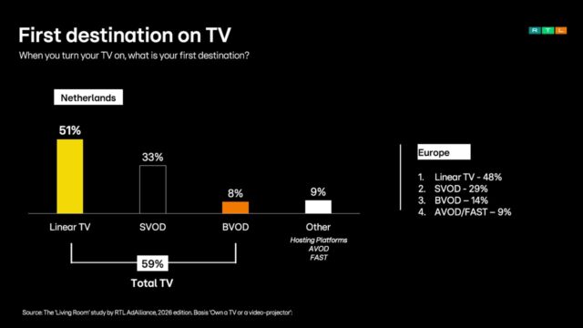 Dit is cruciale informatie voor mediabureaus: wil je direct bij de start van de ‘prime time’ een miljoenenpubliek bereiken in een ontspannen mindset? Dan is de combinatie van lineaire tv en de grotere VOD-platformen nog steeds je krachtigste wapen.