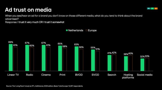 Torenhoge betrouwbaarheid: Het vertrouwen in reclames op lineaire tv is in Nederland nog groter dan het Europese gemiddelde. De consument beschouwt deze omgeving als veilig, gecontroleerd en professioneel.