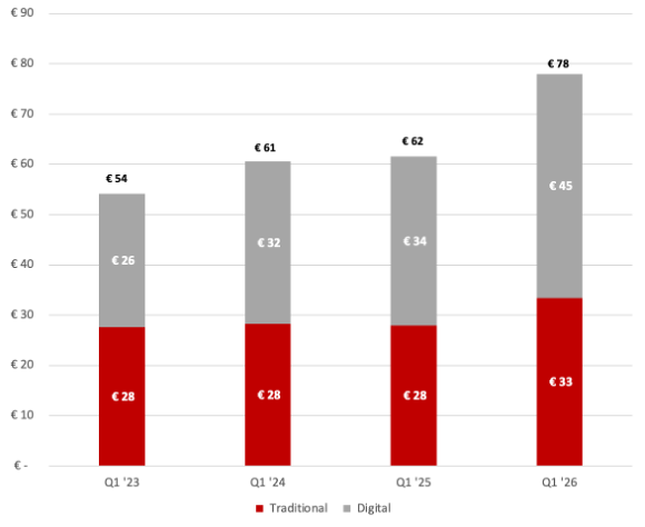 Omzetstijging: De omzet uit DOOH nam in Q1 2026 toe met 32% tot circa € 45 miljoen.