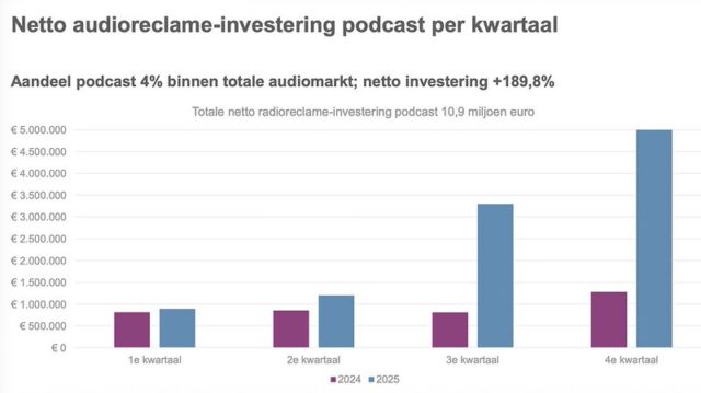 Het totale audioreclamebudget staat op 271 miljoen euro. Hiervan gaat er maar 4% naar podcasts. De meeste uitgave werden pas in de laatste twee kwartalen gedaan, dit wijst erop dat adverteerders misschien hun achterstand gaan inhalen. De resultaten van deze campagnes bepalen of ze in 2026 meer gaan investeren.