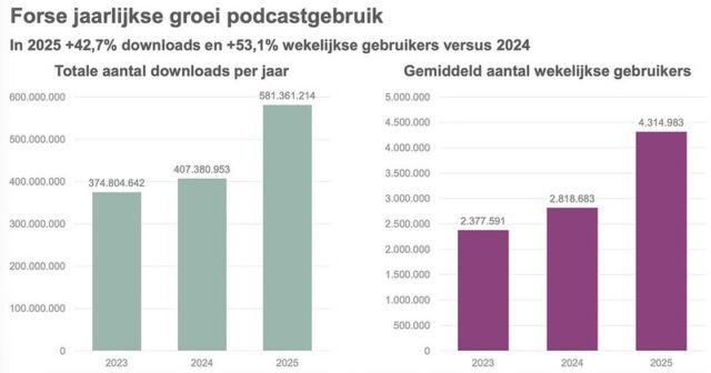 De Nederlandse podcastmarkt groeide in 2025 enorm. Het aantal downloads steeg met 43% tot 581 miljoen. Ondanks de groei, blijft de investering van adverteerders beperkt: slechts 11 miljoen euro ging naar podcast-reclame.